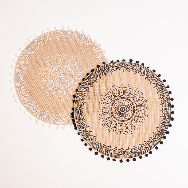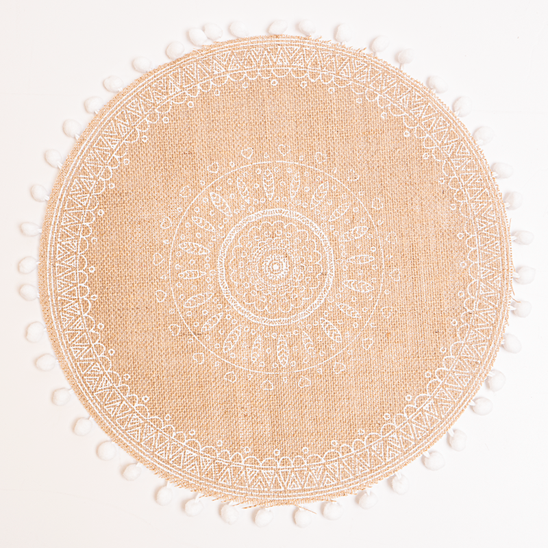 Individual com padrão e pompons. Material: Juta. Medidas: 38 cm